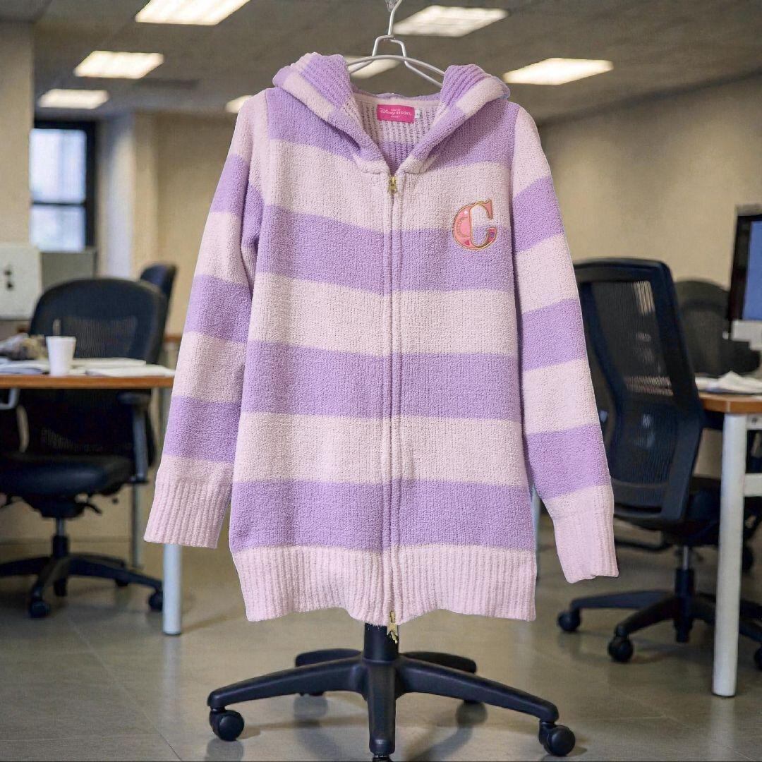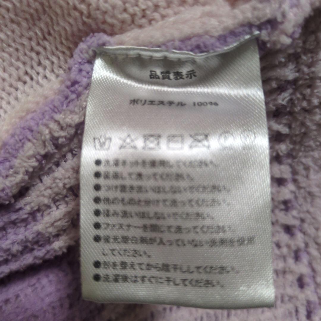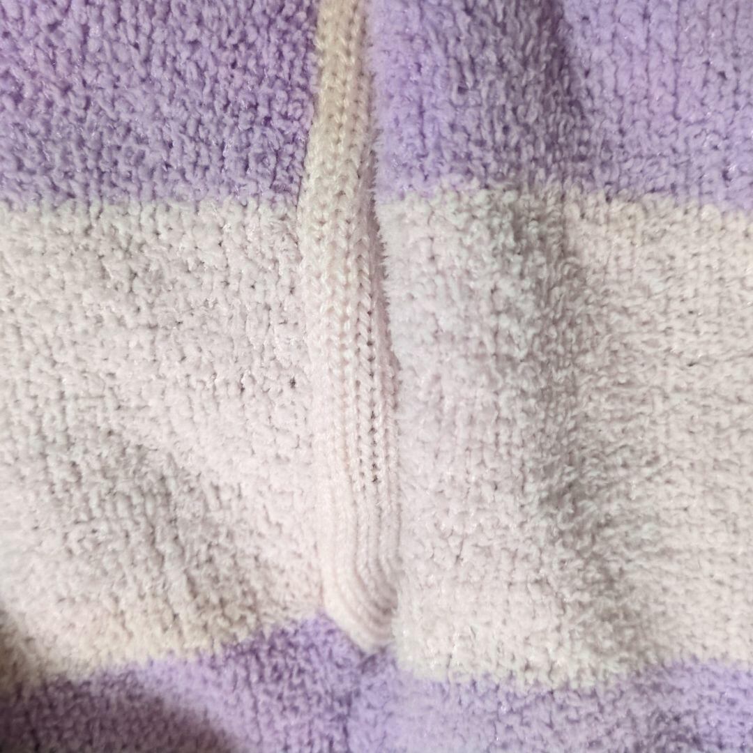 フリース風の柔らかい生地で、パープルとピンクのストライプが特徴のフード付きジップアップセーター。