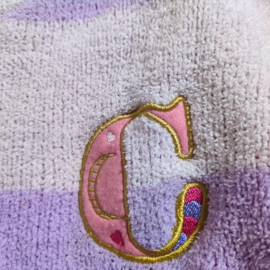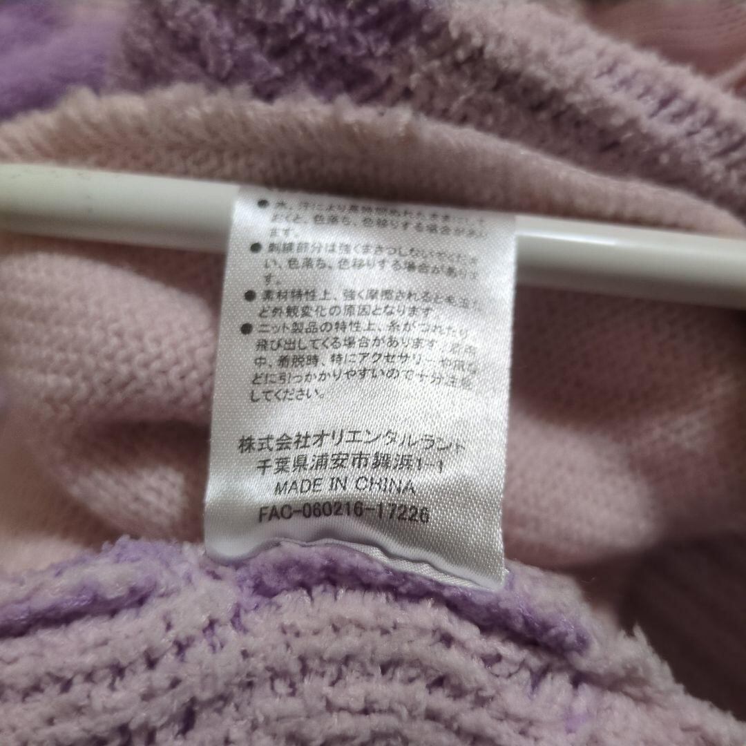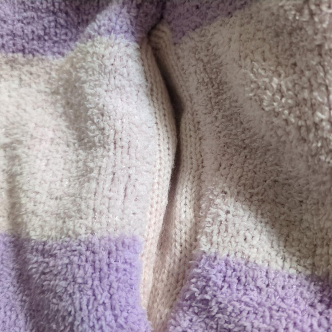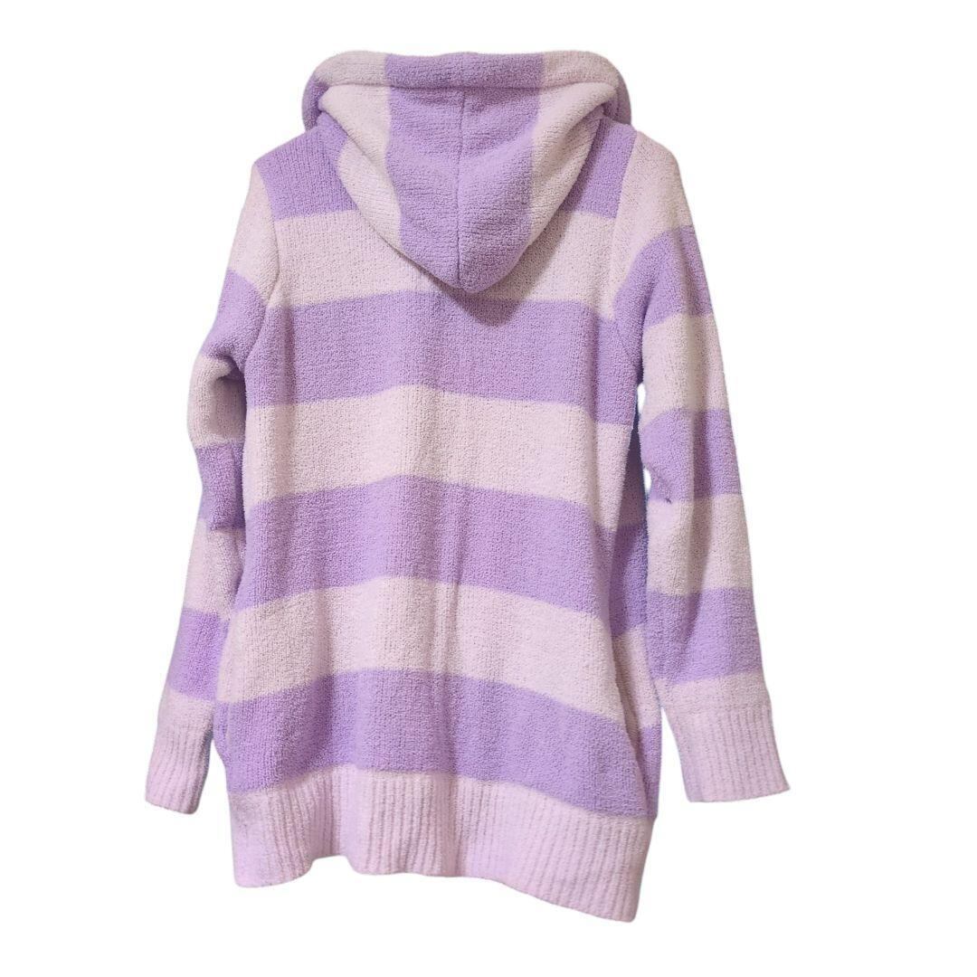 フリース風の柔らかい生地で、パープルとピンクのストライプが特徴のフード付きジップアップセーター。