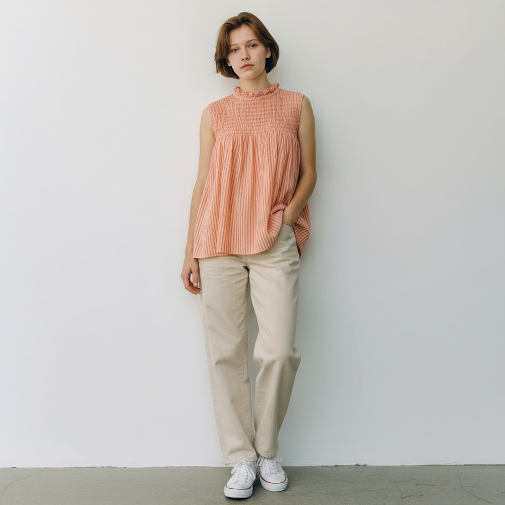 ふんわり揺れるシルエットが魅力のシンプリシテェのノースリーブブラウス。やさしいピンクカラーが顔まわりを明るく見せてくれて、着るだけで女性らしい印象に。ゆったりとしたデザインで体型カバーも叶い、暑い季節でもストレスフリーな着心地です。パンツにもスカートにも合わせやすく、忙しい朝でも「これ1枚で決まる」頼れるアイテムです。